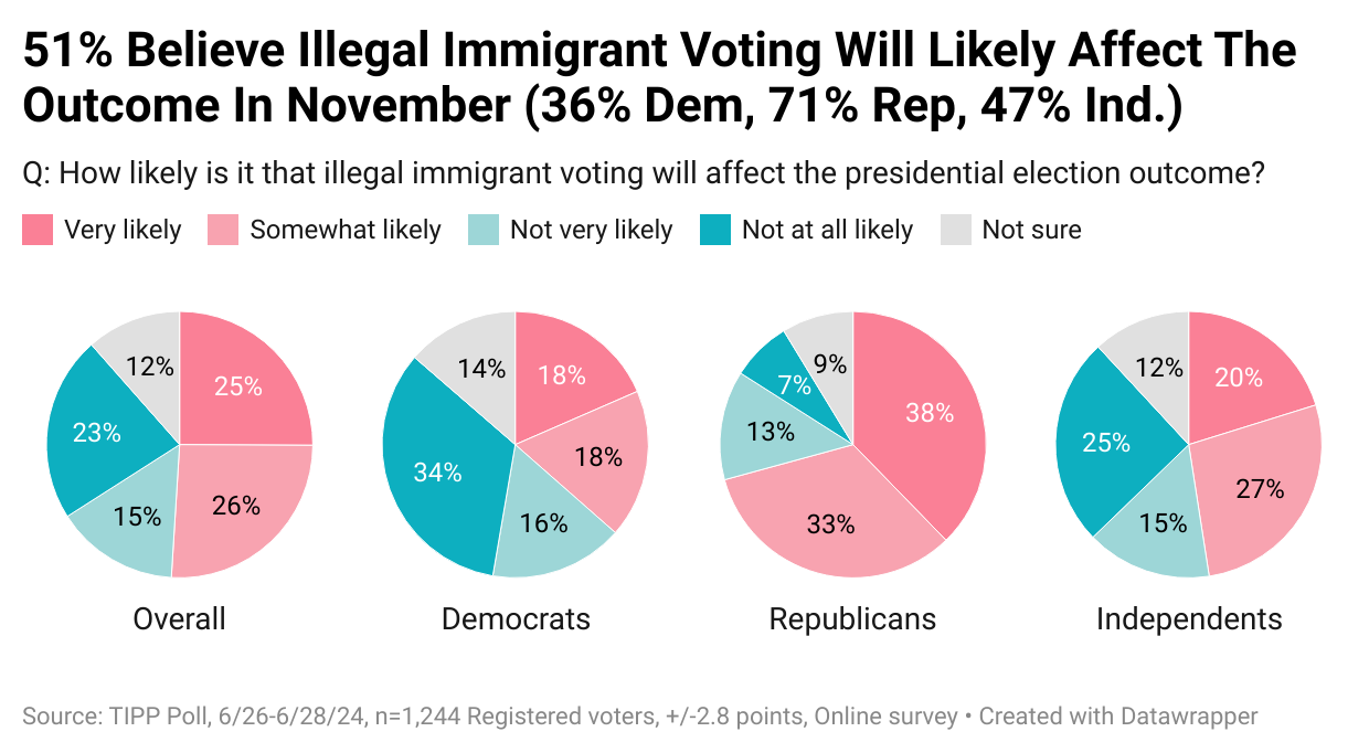 I&I/TIPP asked a follow-on question: "How likely is it that illegal immigrant voting will affect the presidential election outcome?"