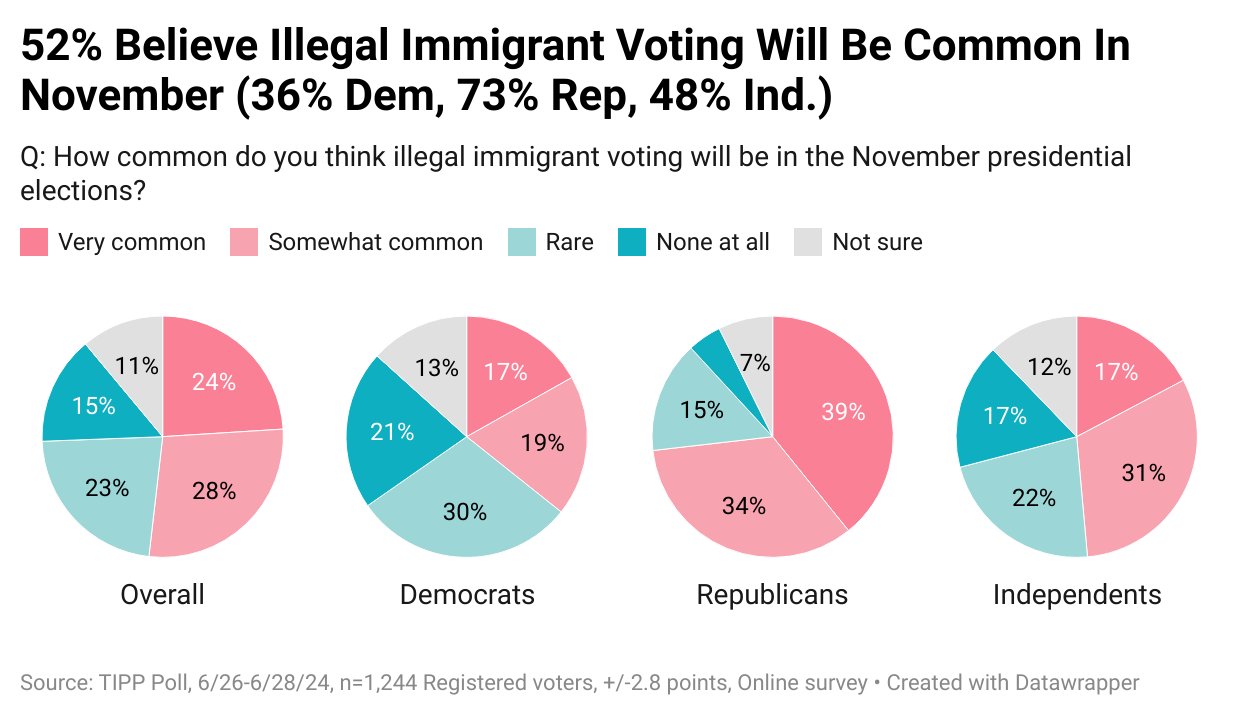 Of those responding, 52% said that they believed voting by those who immigrated to the U.S. illegally would be "common," while just 38% thought such voting would either be "rare" (23%) or "none at all" (15%). Of the remaining, 11% said they "not sure."