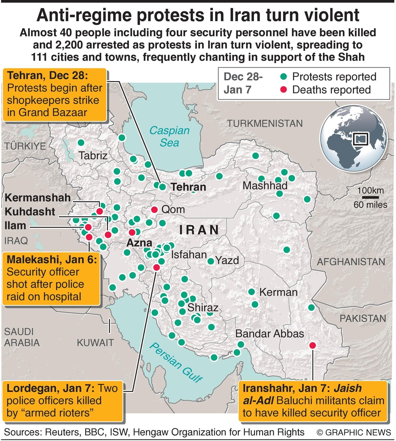 Almost 40 people including four security personnel have been killed and 2,200 arrested as protests in Iran turn violent, spreading to 111 cities and towns, frequently chanting in support of the Shah.