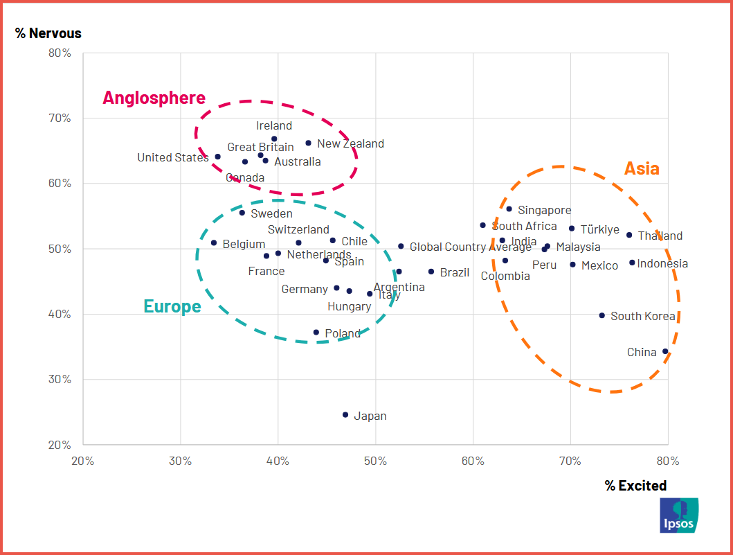 Across 32 countries, people in the United States, United Kingdom, Canada, and Australia are far more likely to feel nervous than excited about artificial intelligence, while most of Asia reports the opposite, with excitement outpacing anxiety in places such as China, South Korea, and Indonesia.