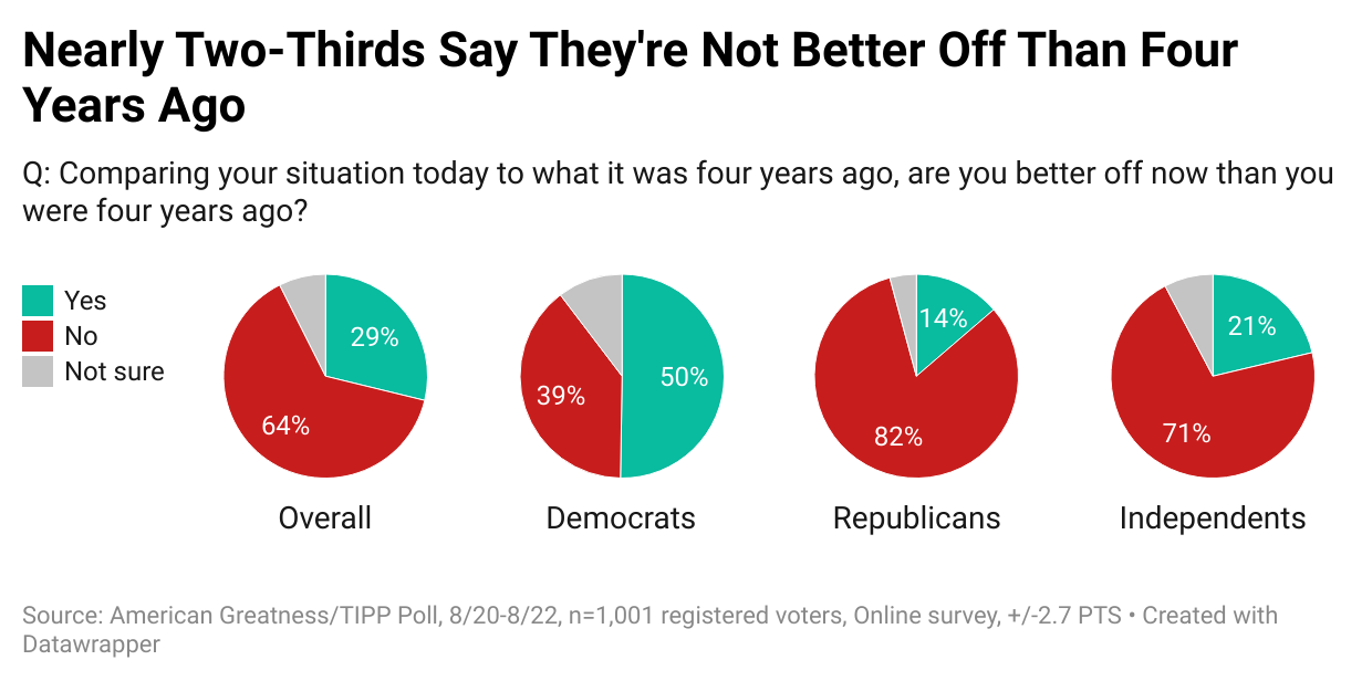 The data does not bode well for incumbents. Nearly two-thirds (64%) of Michigan voters say their situation is worse than it was four years ago. Republicans (82%) and independents (71%) share this sentiment. The exception is among Democrats; 50% feel better off, while 39% do not.