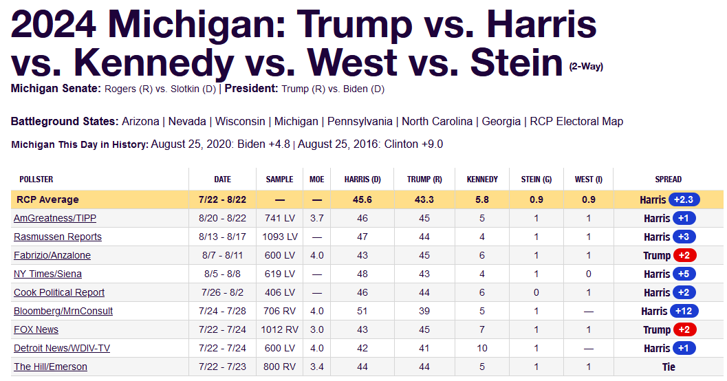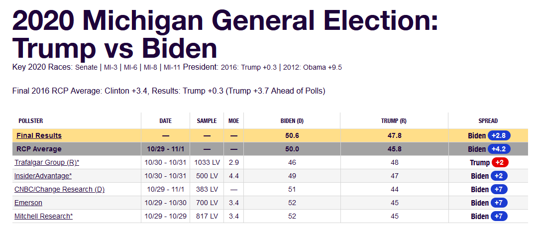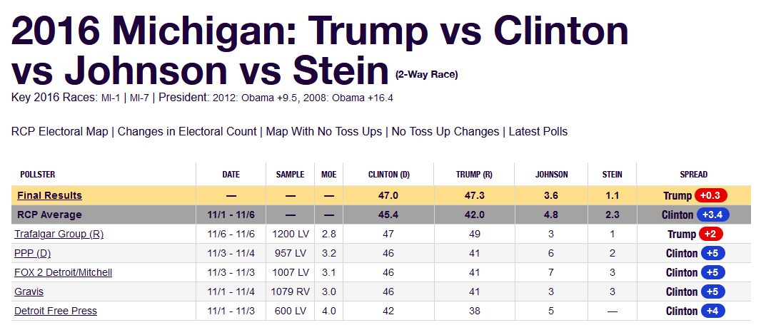For example, in 2016, as shown in the chart below, the final RCP had Hillary Clinton winning Michigan by 3.4 percentage points. Trump won by a slender margin of 10,704 votes or 0.22%.