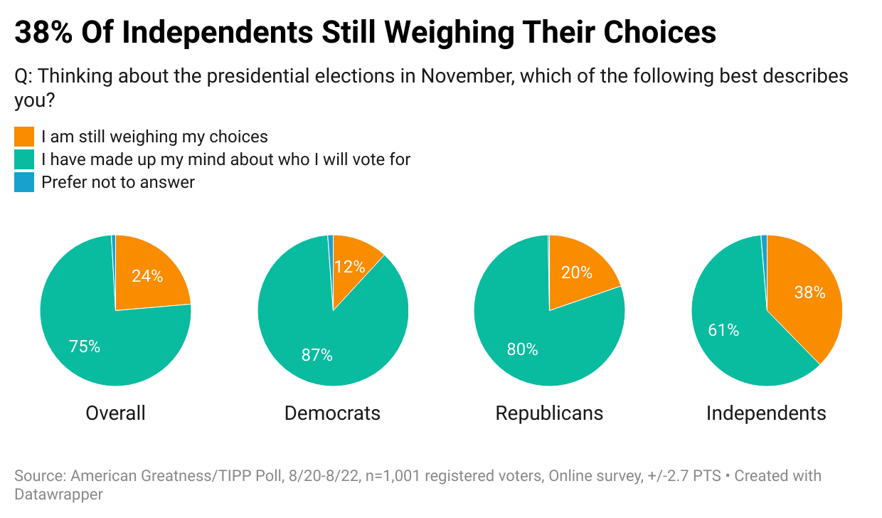 Three-fourths of Michigan voters (75%) have made up their minds, while 24% are still weighing their options. Unsurprisingly, independents (38%) have the largest share of those yet to decide. In comparison, those affiliated with the Democratic Party (87%) and the GOP (80%) have already made firm decisions.