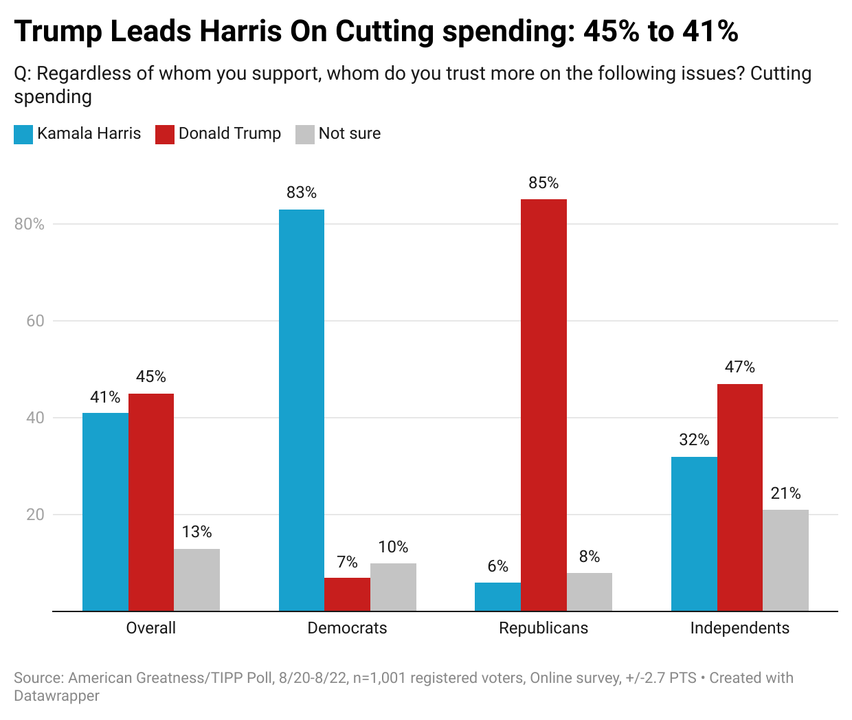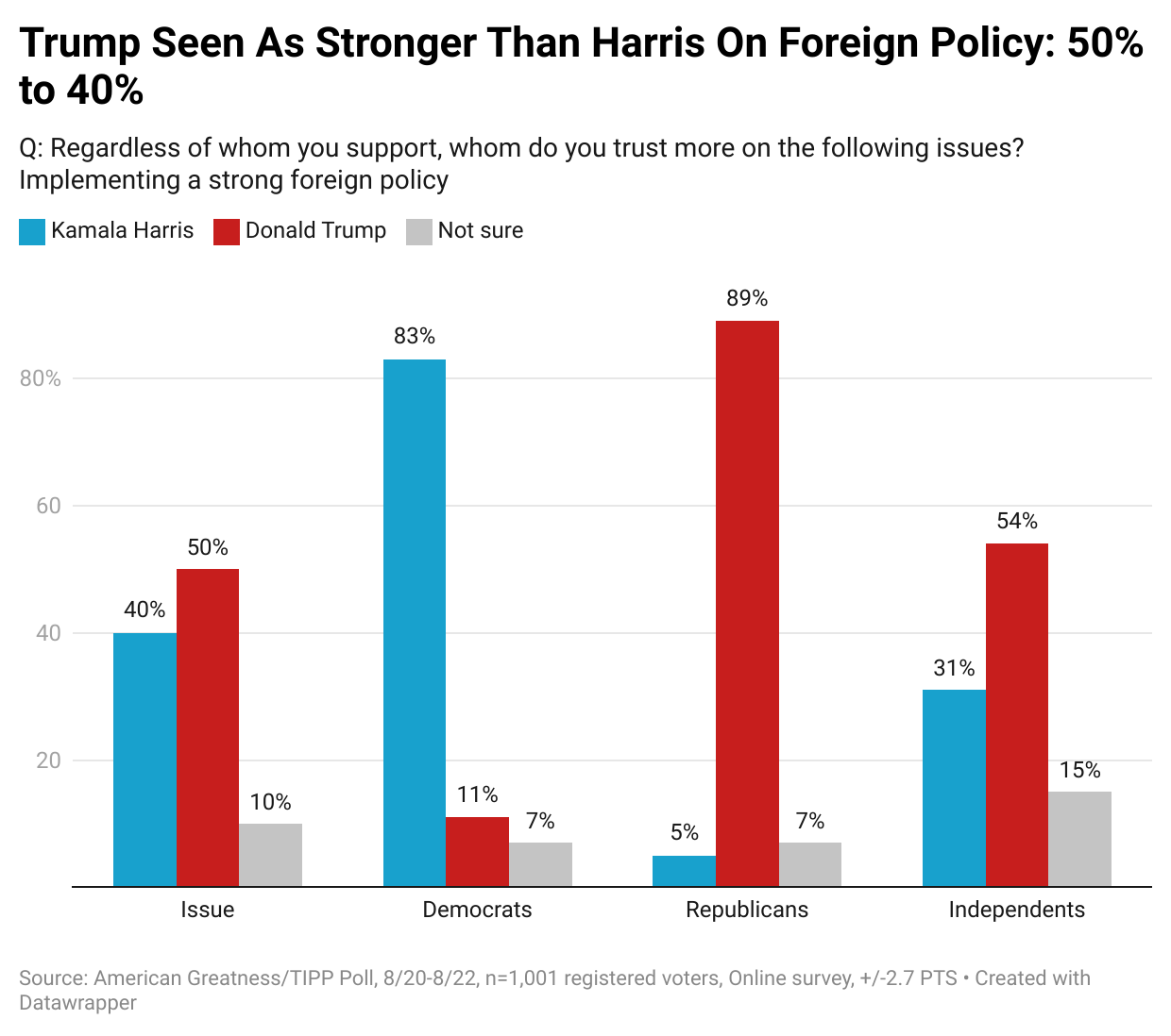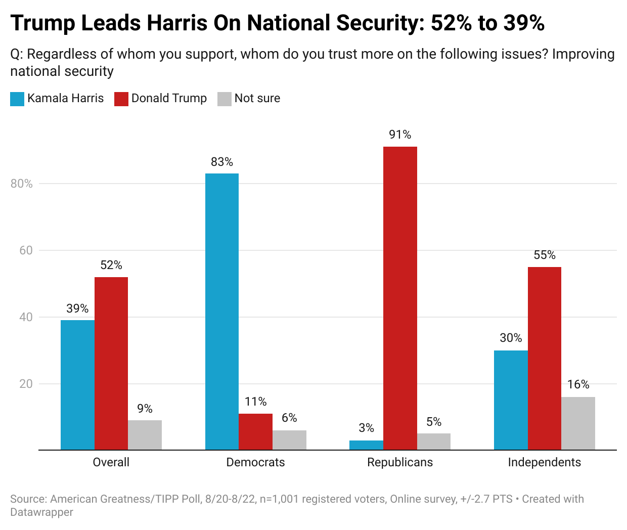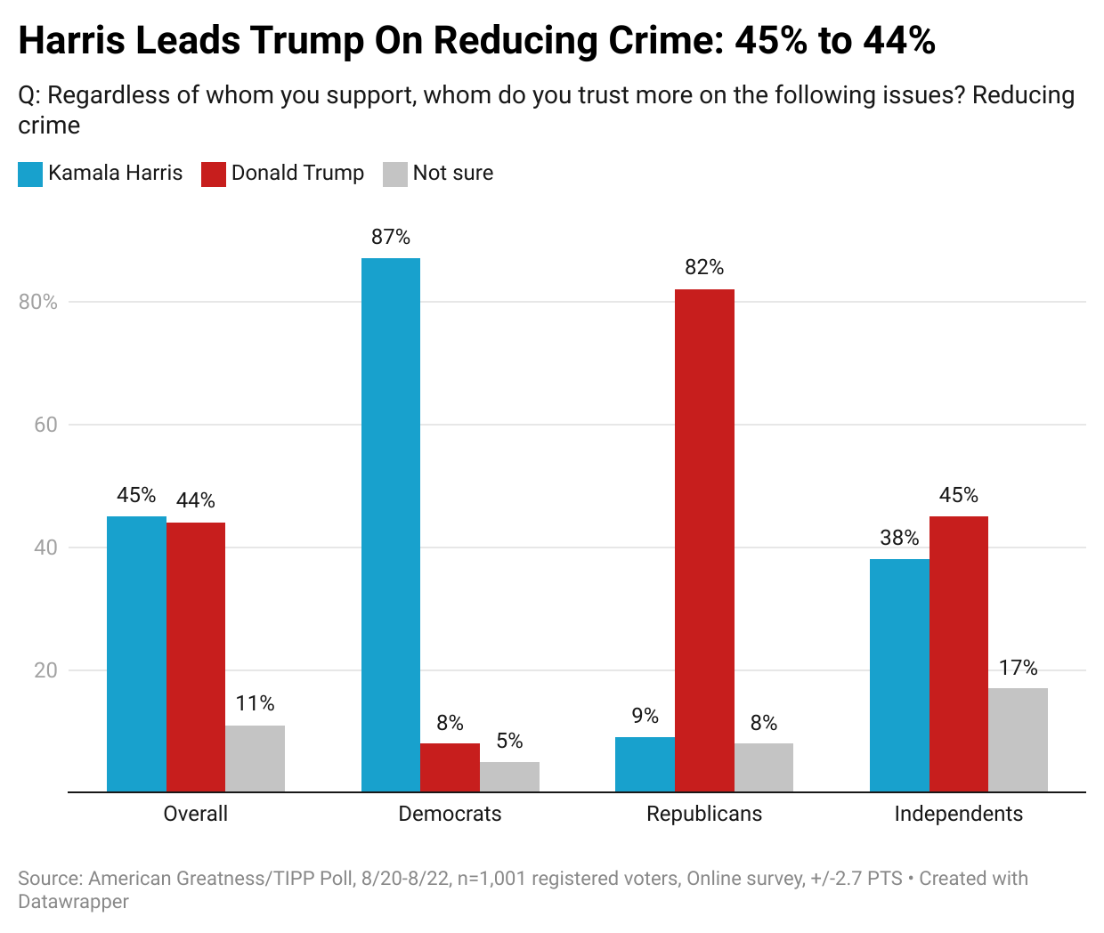 Many attribute the increase in crime to the open border and uncontrolled illegal immigration. Harris does better than Trump, 45% to 44% overall. However, Trump does better than Harris, 45% to 38% with independents.