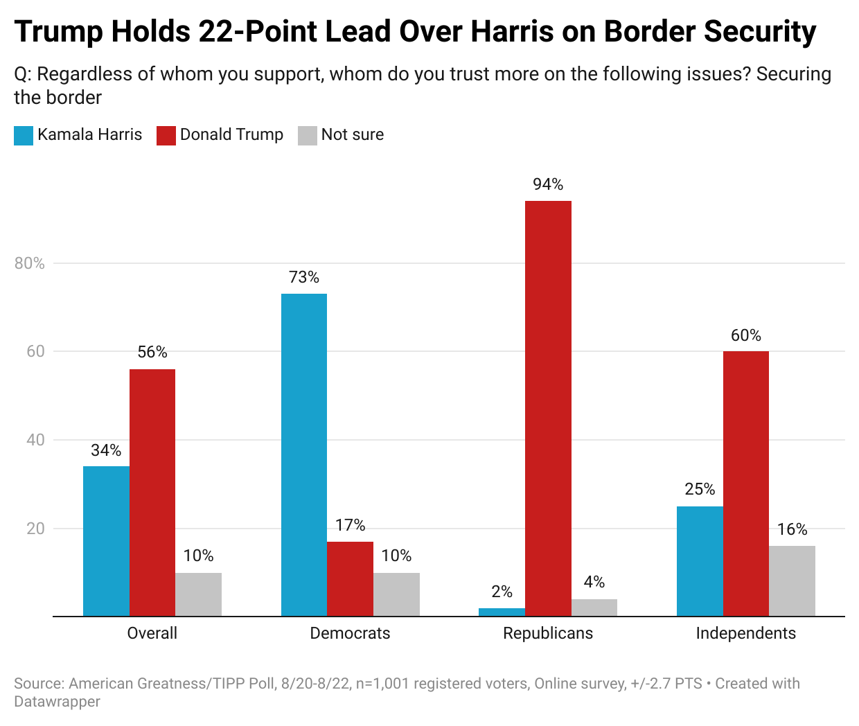 Regarding securing the border, Trump has a 22-point advantage over Harris, 56% to 34%. The gap widens to 35 points among independents, 60% to 25%.