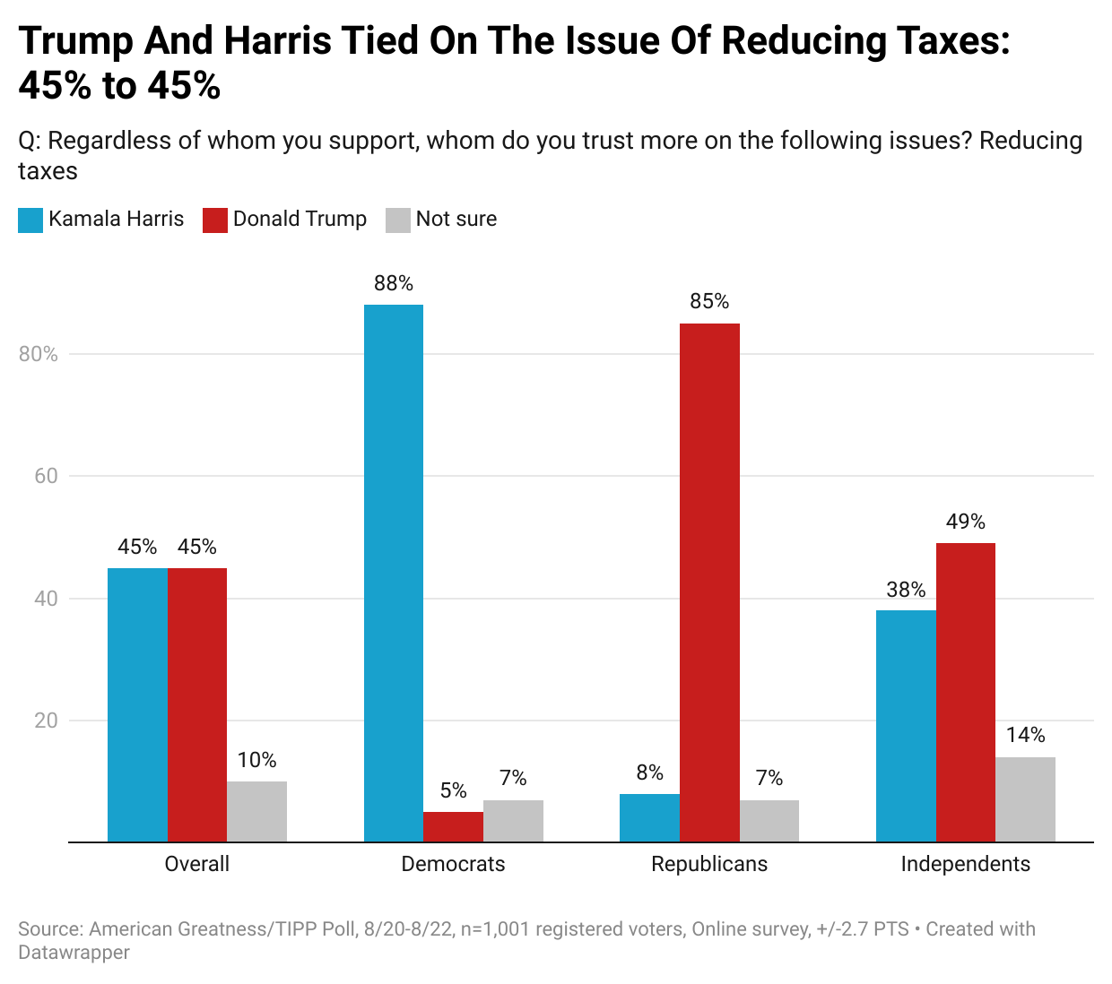 Trump and Harris are tied at 45% on reducing taxes overall. Trump enjoys an 11-point margin with independents.