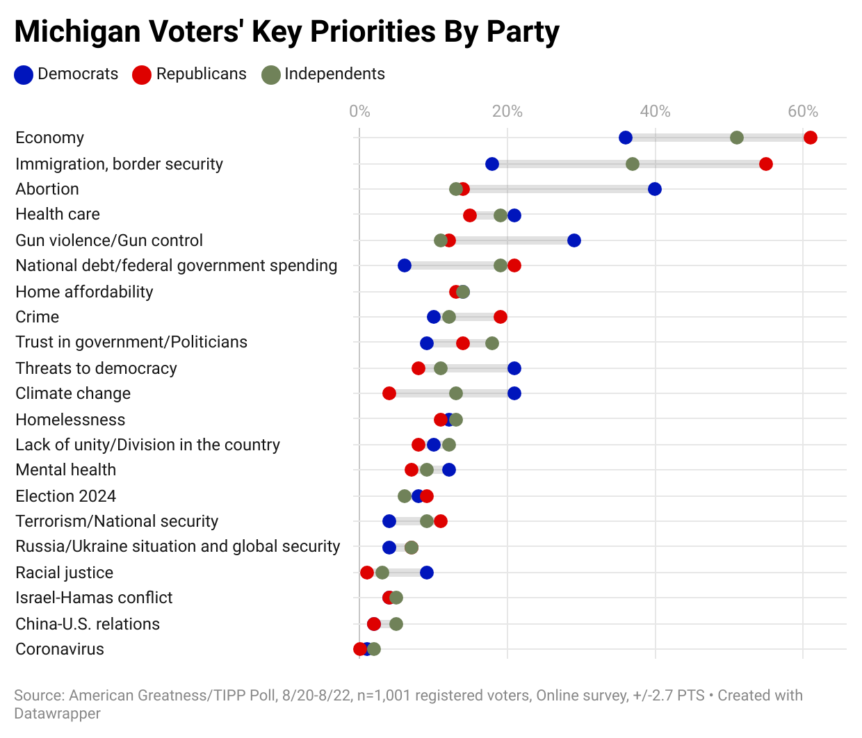 Michigan independents are closer to Republicans than Democrats, with their top issues being the economy (51%), immigration and border security (37%), national debt and federal government spending (19%), and health care (19%). Only a handful rated abortion (13%) and climate change (13%) as important.