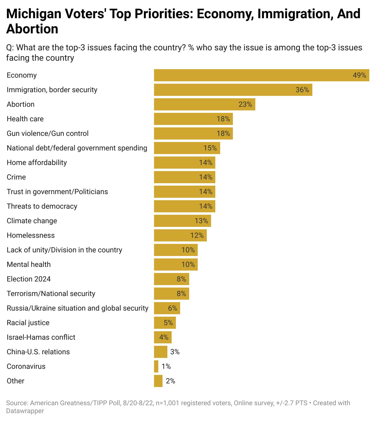 Michigan voters consider immigration the nation's second most important issue, at 36%, following the economy, which garnered 49%.