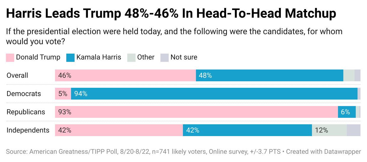 Regarding the economy, Trump beats Harris 49% to 43%. With independents, Trump is ahead by twenty points, 53% to 33%.
