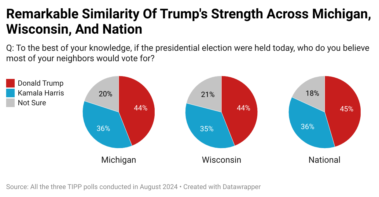 To understand grassroots sentiment and hidden voter dynamics, the TIPP Poll asked respondents in Michigan, Wisconsin, and nationwide: "To the best of your knowledge, if the presidential election were held today, who do you believe most of your neighbors would vote for?" The responses were strikingly similar across all three polls. Trump is perceived to have a strong and consistent base of support in both Michigan and Wisconsin, as well as nationally, compared to Kamala Harris. This consistent perception across key battleground states suggests that Trump is currently in a commanding position, potentially giving him a significant advantage.