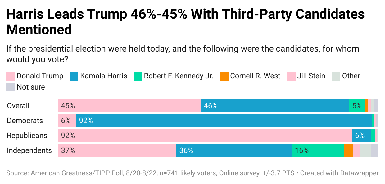 A recent American Greatness/TIPP Poll of 741 likely voters in Michigan reveals a tight race: In a head-to-head matchup, Harris leads Trump by just two points, 48% to 46%. When third-party candidates are factored in, Harris’s lead narrows to a single point (46% to 45%), well within the poll’s margin of error. Before Biden stepped down, Trump held a 2.1-point lead over him in the RealClearPolitics average, 44.0% to 41.9%.