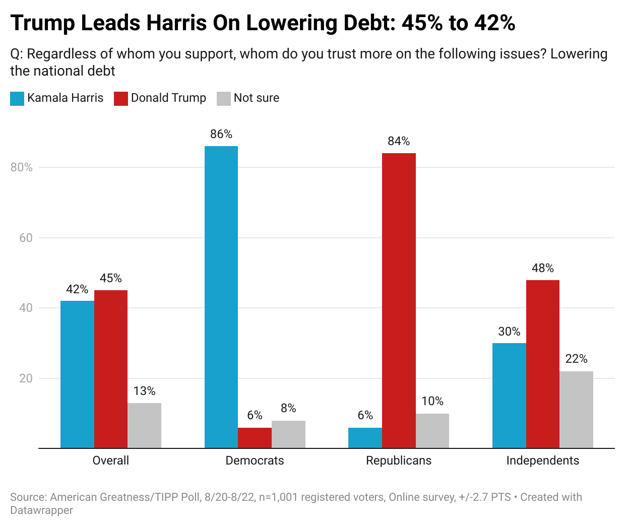 Along the same lines, Trump holds a three-point advantage in lowering the debt, with 45% preferring him compared to 42% for Harris. With independents, his advantage increases to 18 points—48% to 30%.