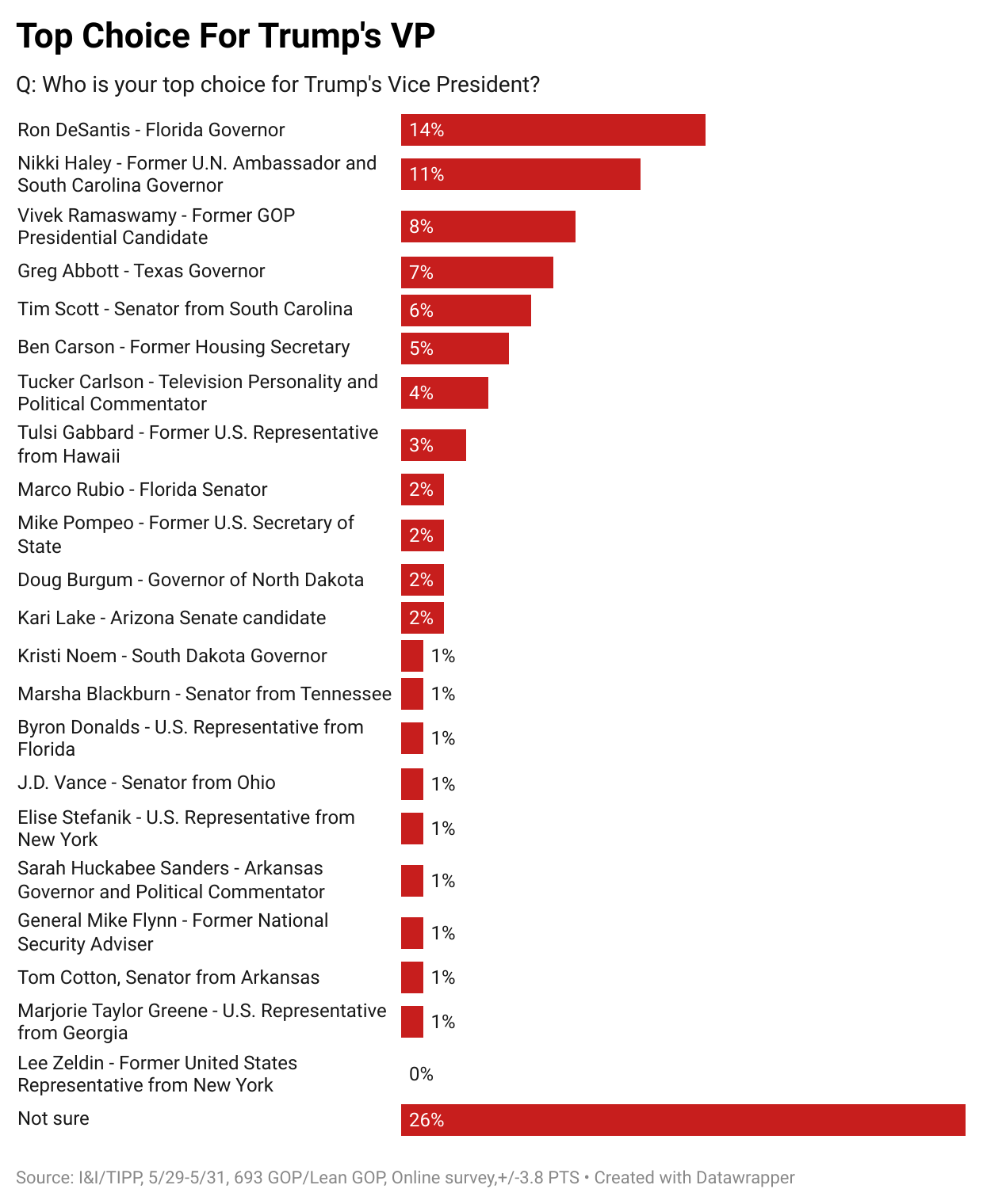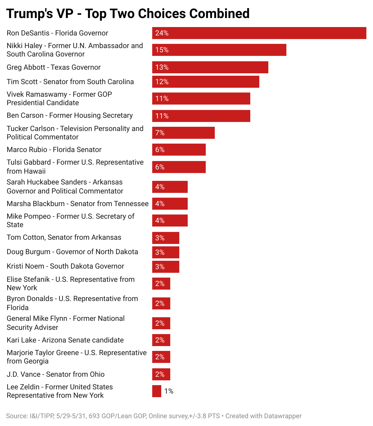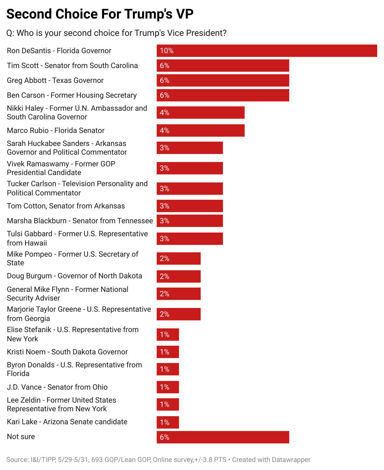 The May national online I&I/TIPP Poll asked Republican voters to reveal their first and second choices to be Trump’s No. 2. In its June poll, taken from May 29 through 31, I&I/TIPP once again asked a national sampling of registered Republicans (a total of 693 Republican and Republican-leaning voters, yielding a margin of error of +/-3.8 percentage points) the same questions.