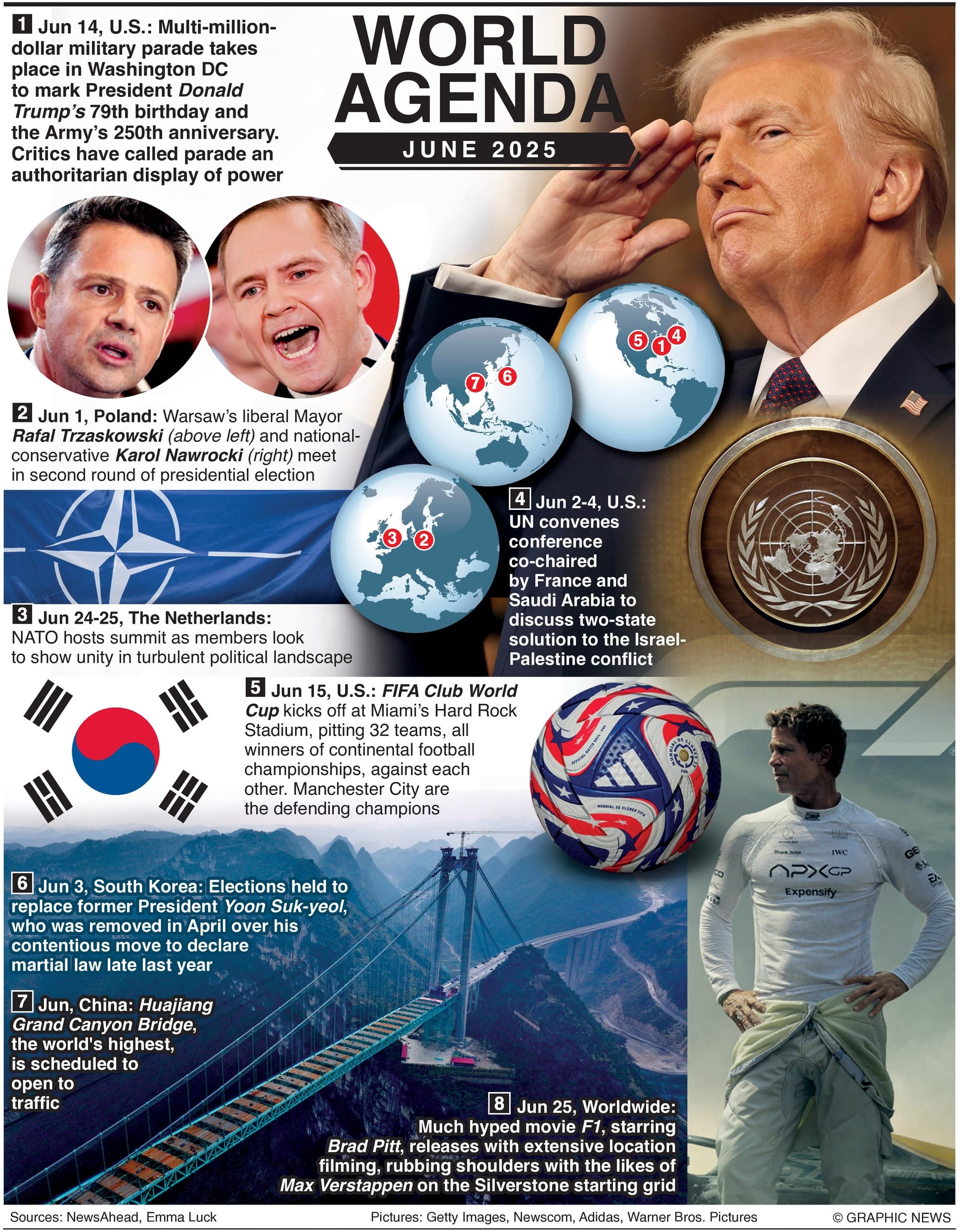 June 1, 2025 - June 30, 2025 - Events in June include a military parade to mark President Trump’s 79th birthday and the U.S. Army’s 250th anniversary; presidential elections in Poland and South Korea; a UN conference on the Israel-Palestine conflict; and a NATO summit in the Netherlands. The FIFA Club World Cup kicks off in the U.S., the world’s highest bridge opens in China, and the Hollywood film F1 is released.