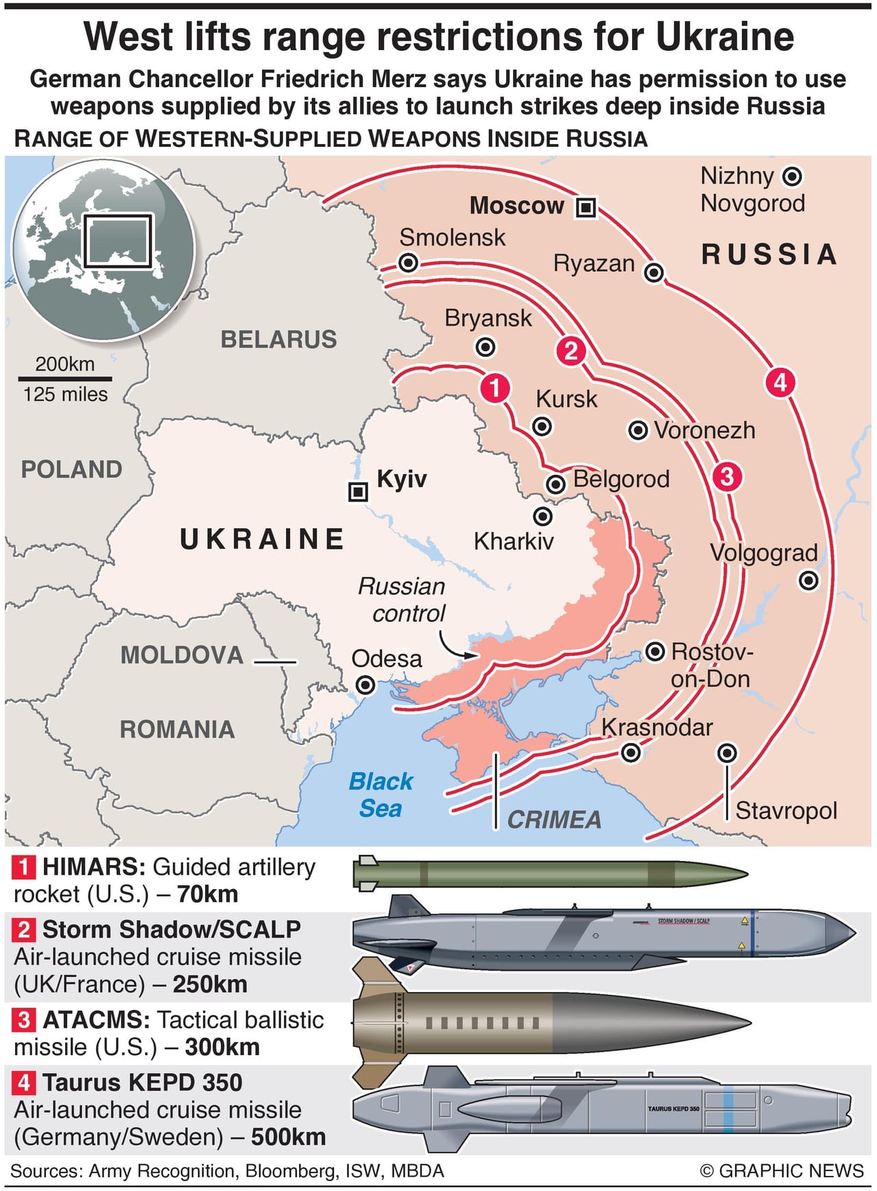 - Storm Shadow/SCALP cruise missiles (UK, France; ~250km range)