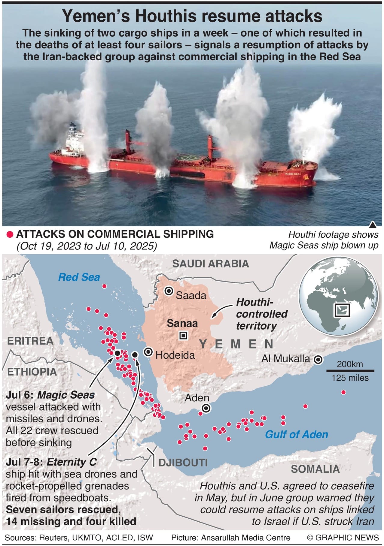 These attacks signal the Houthis’ return to targeting vessels in the Red Sea, a campaign that began in November 2023 but had largely paused since December 2024. The group claims the assaults are aimed at ships linked to Israel, in solidarity with Palestinians amid the war in Gaza. However, they have often targeted vessels without clear ties to Israel or its allies.