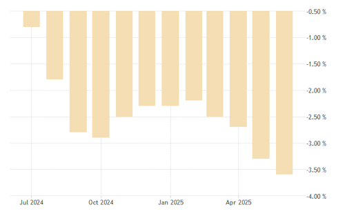 Factory deflation persisted into a 33rd month, with the producer price index falling 3.6% from a year earlier, the National Bureau of Statistics said. The decline was the most since July 2023 and sharper than any economists had forecast. The consumer price index unexpectedly increased 0.1% and ended a four-month falling streak, although it likely reflected the short-term effect of government subsidies rather than a lasting recovery in confidence.