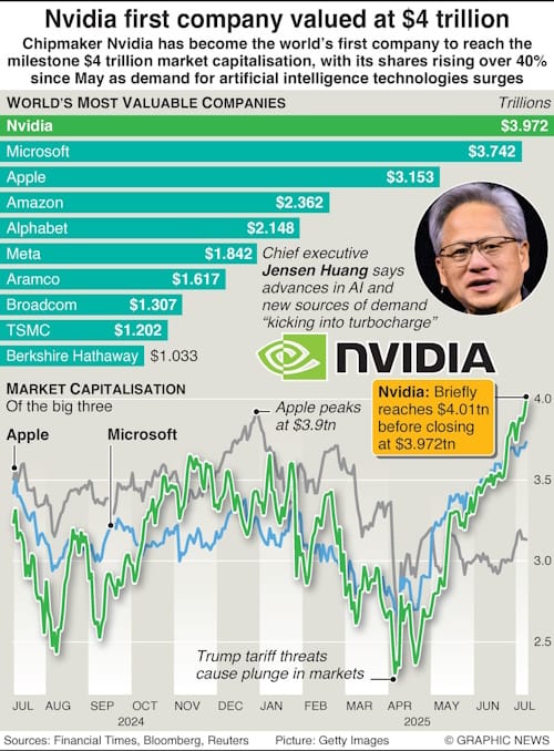 Nvidia had already surpassed Apple’s $ 3.9 trillion record set in December 2024 and surged by 40% since May. Confidence in AI stocks had been shaken by the emergence of the DeepSeek artificial-intelligence model developed in China to run on much less powerful chips, with a much lower energy consumption, and President Donald Trump’s tariff threats.