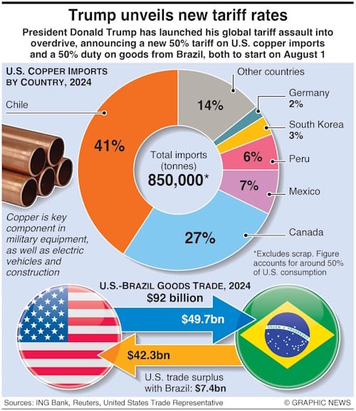 President Donald Trump has announced a new 50% tariff on U.S. copper imports and a 50% duty on goods from Brazil, both to start on August 1.