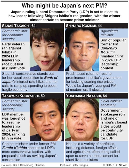 According to a two-day telephone survey conducted from Thursday, Takaichi was chosen by 28.0 percent of the respondents, followed by farm minister Shinjiro Koizumi with 22.5 percent. The two are seen as the main contenders in the Oct. 4 leadership contest to elect a successor to Prime Minister Shigeru Ishiba, who announced his resignation on Sunday.