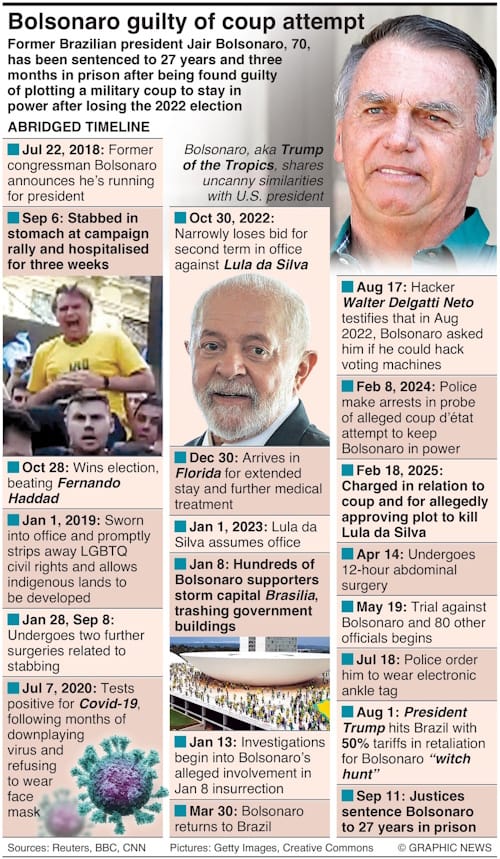 Former Brazilian president Jair Bolsonaro, 70, has been sentenced to 27 years and three months in prison after being found guilty of plotting a military coup to stay in power after losing the 2022 election.