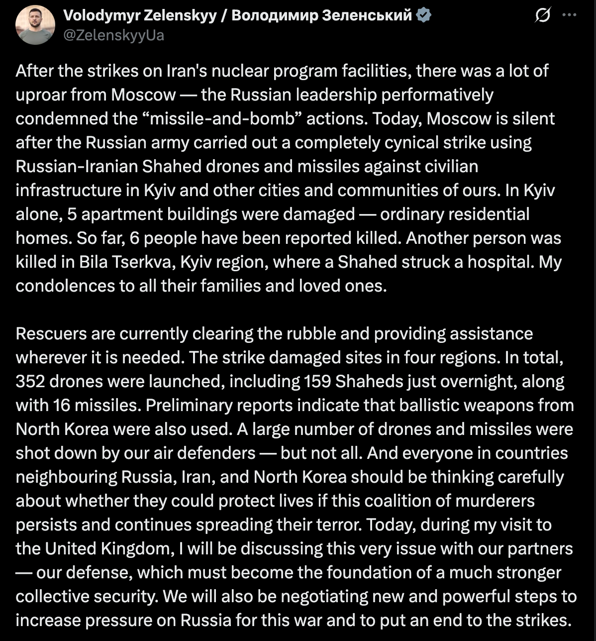 Zelensky said 352 drones, including 159 Shaheds and 16 missiles, were launched overnight. Preliminary reports indicate North Korean ballistic missiles may have been used.